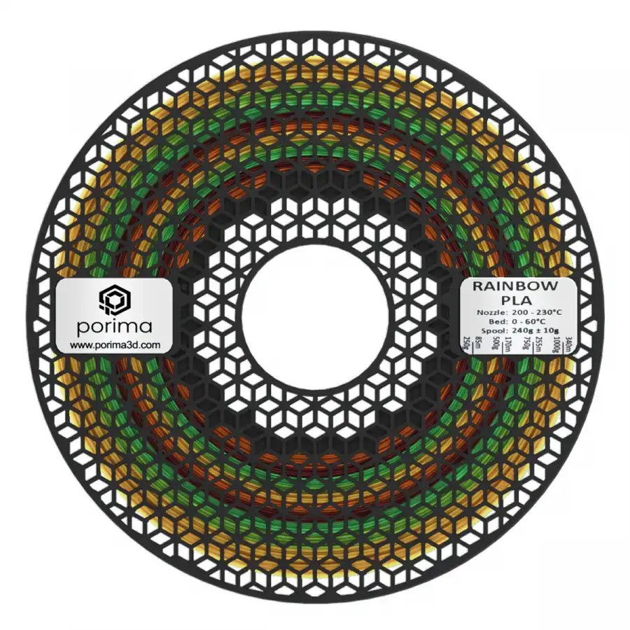 Porima Rainbow PLA, Porima markasının ürettiği, çok renkli geçişlere sahip estetik görünümlü bir PLA filamenttir. Baskı sırasında filament rengi yavaşça değişir, bu da özellikle dekoratif ve görsel odaklı modellerde dikkat çekici sonuçlar elde edilmesini sağlar.